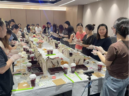 活动尚未开始,现场已洋溢着轻松愉悦的氛围,长桌上整齐摆放着各式制作工具和丰富多彩的月饼原料。在大家热切的目光中,专业老师细致讲解并演示了月饼制作的每一个步骤——从如何搓匀皮料、包馅收口,到压模成型、脱模摆盘,员工们认真聆听,跃跃欲试。动手环节一开始,大家便纷纷挑选自己心仪的馅料和模具,投入到这场温馨雅致的的活动中。 “你看我这个皮是不是有点薄?”“这个花纹压出来真好看!”活动现场瞬间热闹起来。有的员工手法熟练,一气呵成,月饼胚圆润饱满、花纹清晰;有的虽是初次尝试,却在老师的耐心指导和同事的鼓励下渐入佳境。大家互相交流着手上的“作品”,笑声、赞叹声、探讨声此起彼伏,空气中弥漫着淡淡的甜香与温馨的气息。